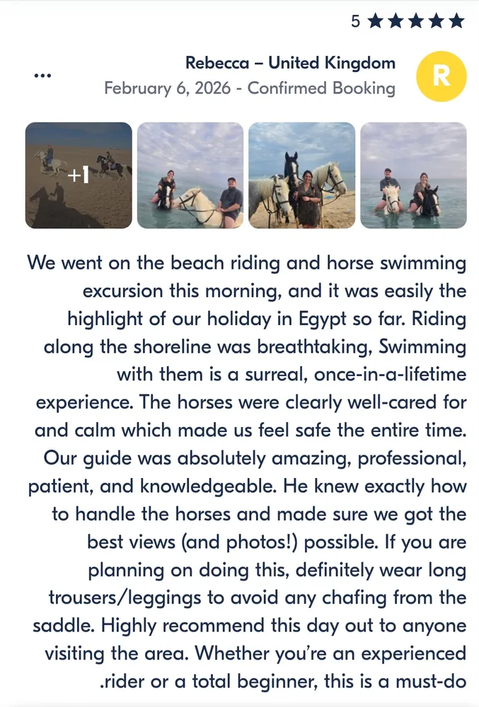 “This was one of the most amazing experiences I had in Hurghada! Riding the horse along the beach and swimming in the sea was absolutely magical. The horses were very calm and the guides were professional. I highly recommend this trip!”